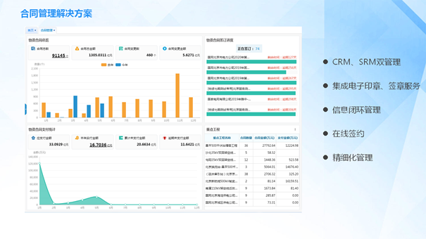 合同管理系统为企业提供合同全生命周期过程管理。该系统以企业CRM、SRM数据为基础,实现合同条款、合同起草、合同分包、合同变更、发票、收付款等信息闭环管理,通过集成第三方签约服务,实现合同、订单的在线签约,提升企业合同精细化管理水平和执行效率。