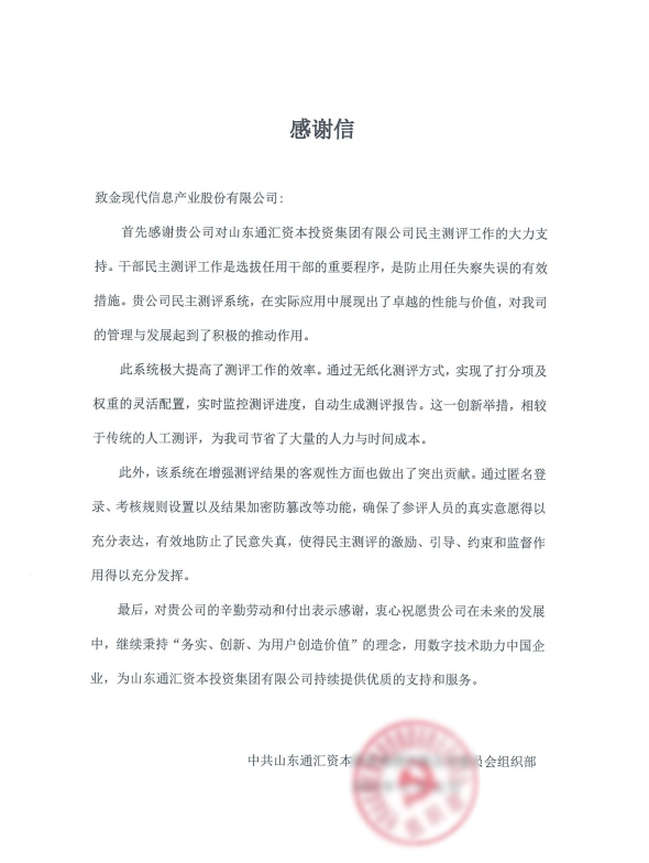 山东通汇资本投资集团是山东高速集团控股子公司,通过开云(中国)的民主测评系统,实现了干部测评的无纸化,不仅确保了参评人员的真实意愿得以充分表达、防止民意失真,还大大提高了组织民主测评工作的效率,为通汇资本节省了大量时间和人力成本。