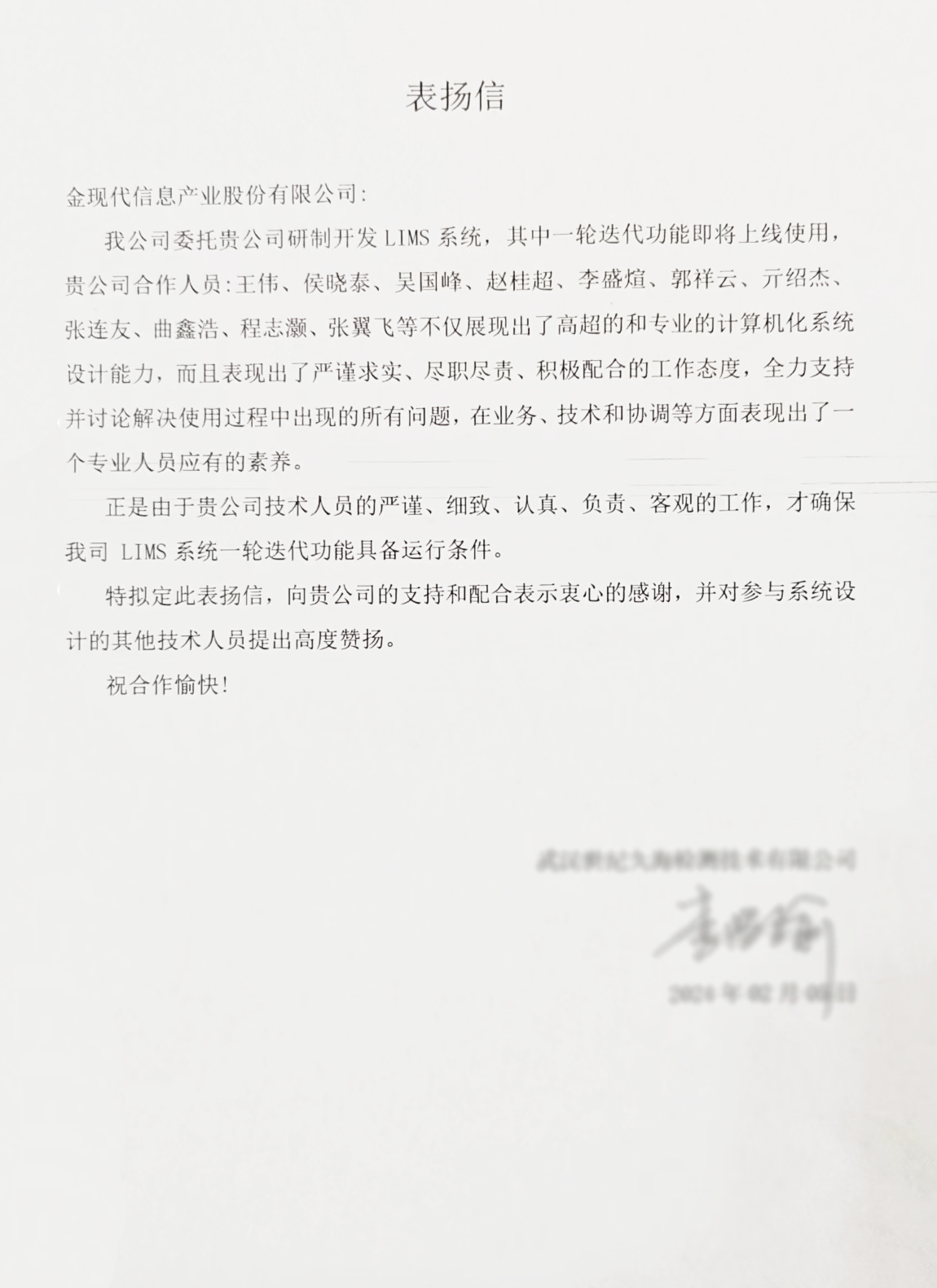 “正是贵公司技术人员严谨、细致、认真、负责、客观的工作,才确保LIMS系统的平稳运行。”