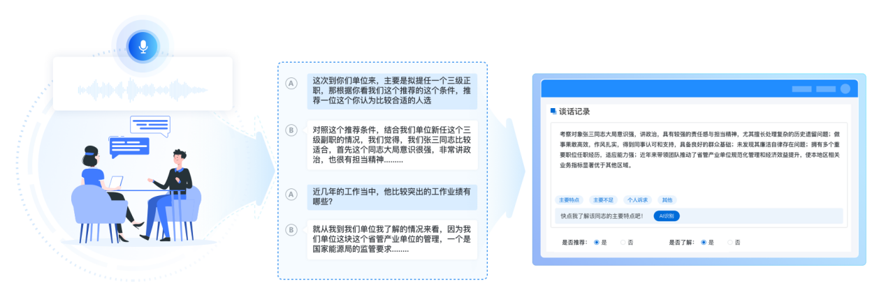 2025年,在“人工智能+”行动的推动下,该公司组织部引入了一套先进的干部考察谈话系统,彻底改变了传统调研模式。如今,工作人员无需再手动记录谈话内容,系统通过语音识别技术实时转写谈话内容,生成“原汁原味”的谈话记录。考察结束后,系统还能智能汇总各小组的谈话记录,并基于大语言模型自动生成个性化的考察报告,大幅提升了工作效率。