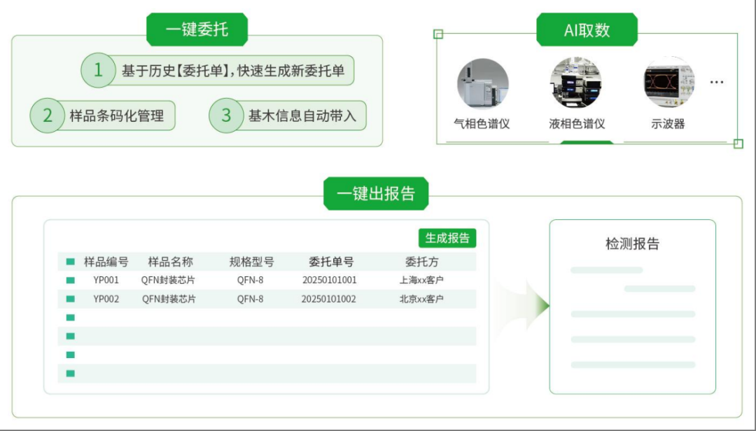 深度集成:无缝对接检测设备,实现数据自动采集,并关联委托单、分析项、质量标准等业务模块,构建全流程闭环管理。