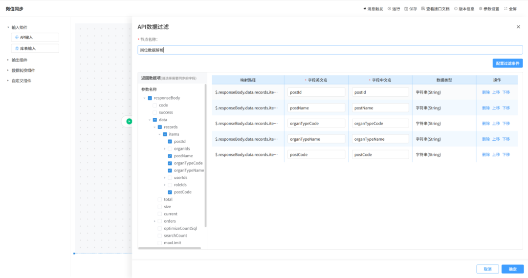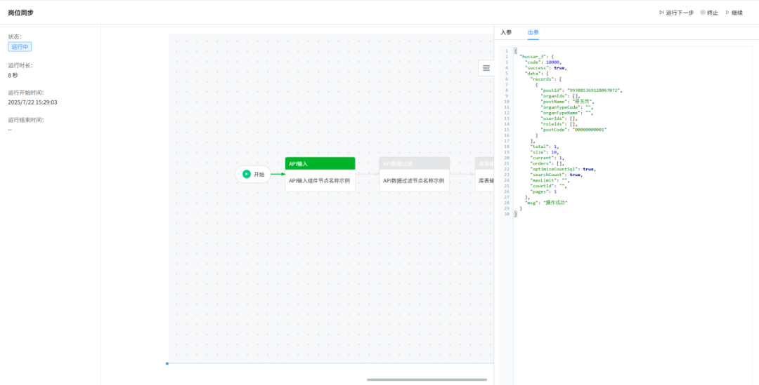 同时,支持丰富的标准化组件与灵活的画布编排,开发时只需拖拽组件即可完成接口二次开发,大幅减少人工编码量及出错概率;此外,接口模拟调用功能可提前进行调用测试。