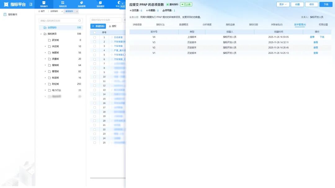 借助指标开云官方注册,变更可实现全程留痕与实时同步,业务人员通过可视化界面修改计算逻辑后,系统会自动记录版本迭代轨迹,全公司可统一查看最新指标口径,彻底避免数据口径混乱问题。